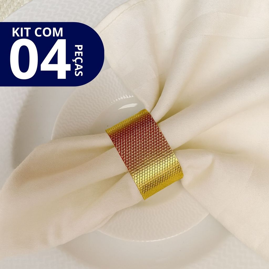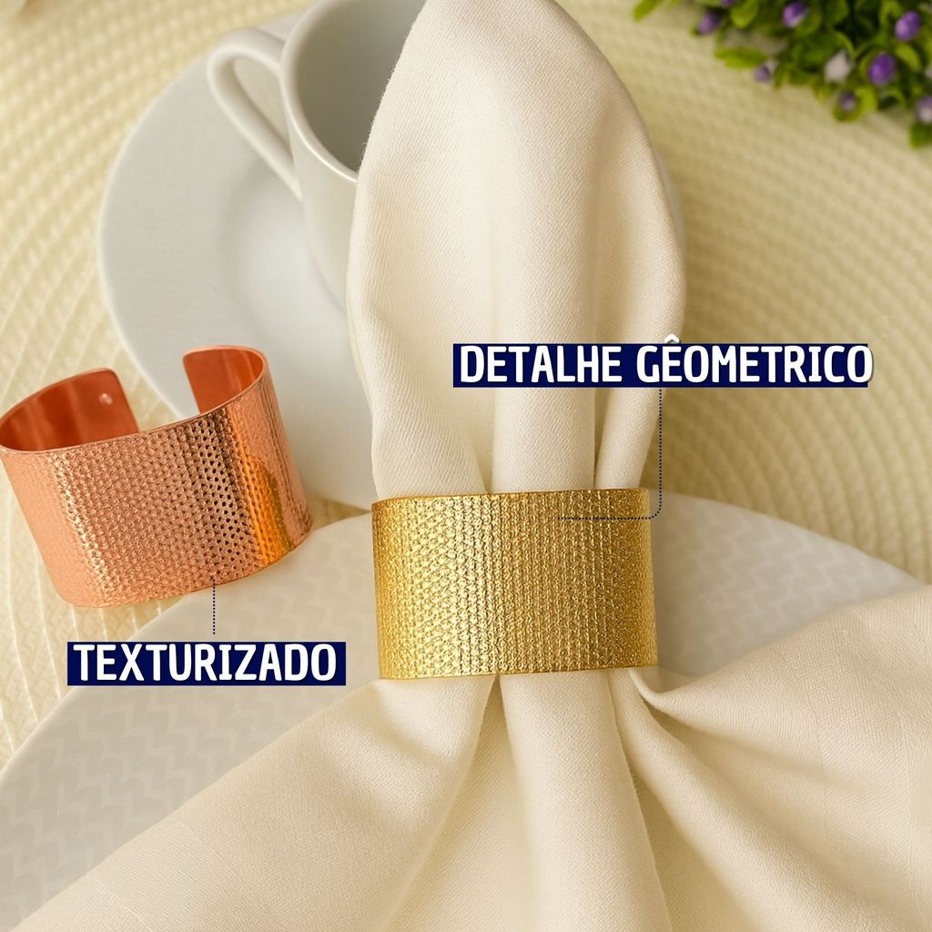 O Kit com 4 Anéis Porta Guardanapo Metal Geométrico Texturizado é perfeito para quem deseja elevar a mesa posta com elegância e modernidade. Com design contemporâneo, acabamento metálico e textura geométrica em relevo, os anéis proporcionam um visual sofisticado e marcante. Ideais para almoços, jantares, eventos especiais ou uso diário, eles valorizam a apresentação da mesa e harmonizam com diferentes estilos de decoração.