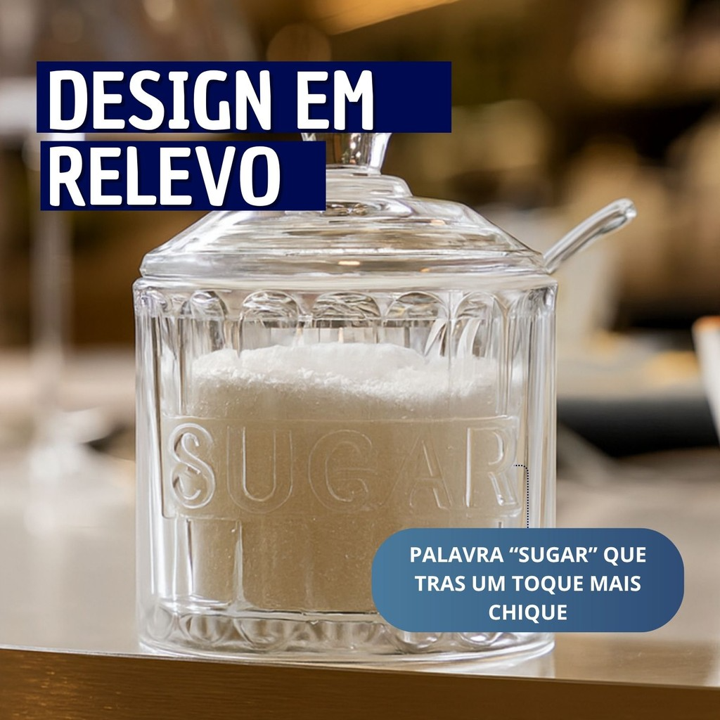 Além de armazenar açúcar, pode ser utilizado para adoçantes, geleias, mel ou granulado, tornando-se uma peça versátil e funcional.