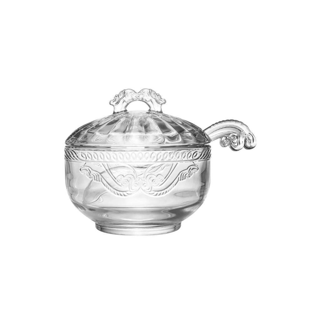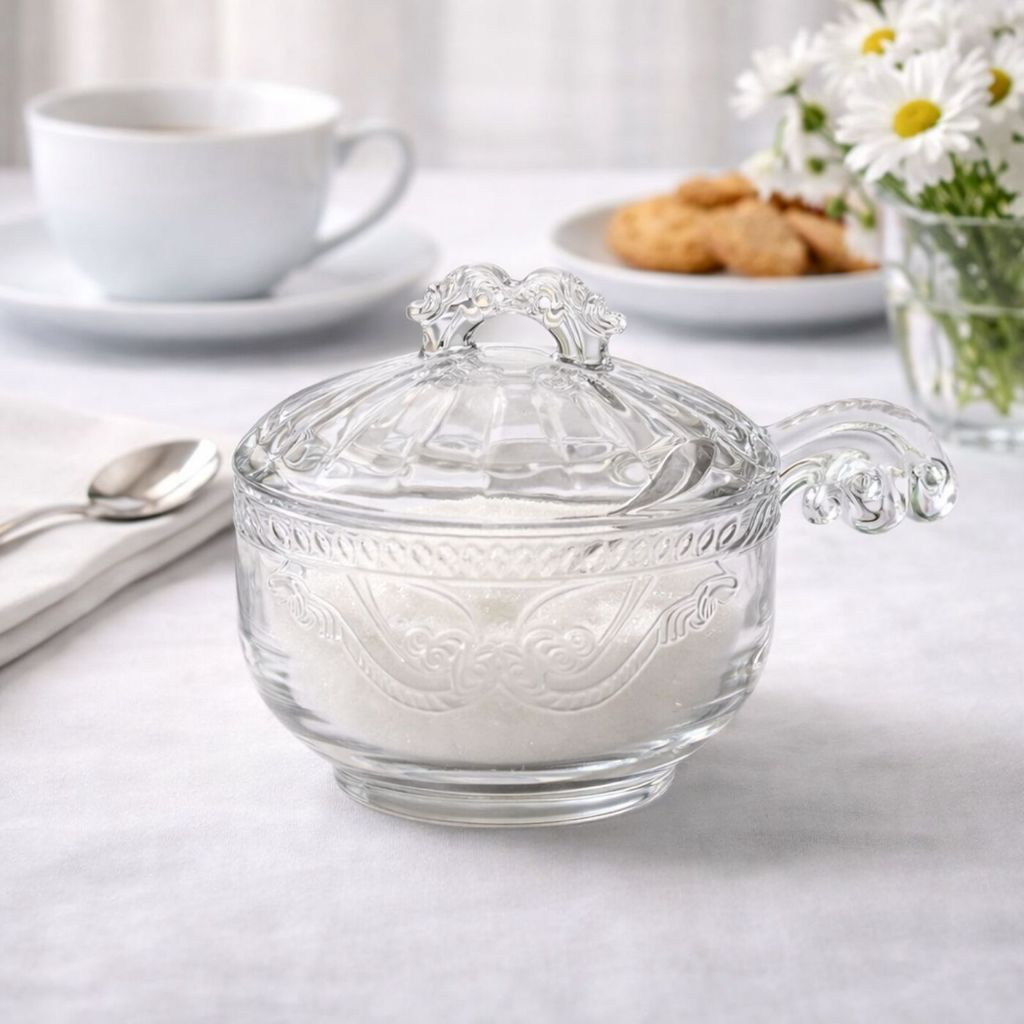 Açucareiro em vidro com design clássico e elegante, ideal para compor mesas de café, chá ou café da manhã com sofisticação. Possui detalhes em relevo que valorizam a peça, tampa com puxador decorativo e alça lateral que facilita o manuseio. Transparente, permite visualizar o conteúdo com praticidade, sendo perfeito tanto para uso diário quanto para ocasiões especiais.
