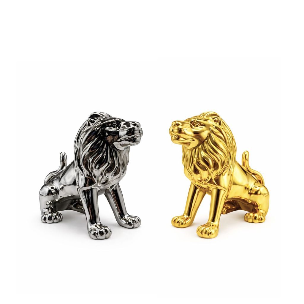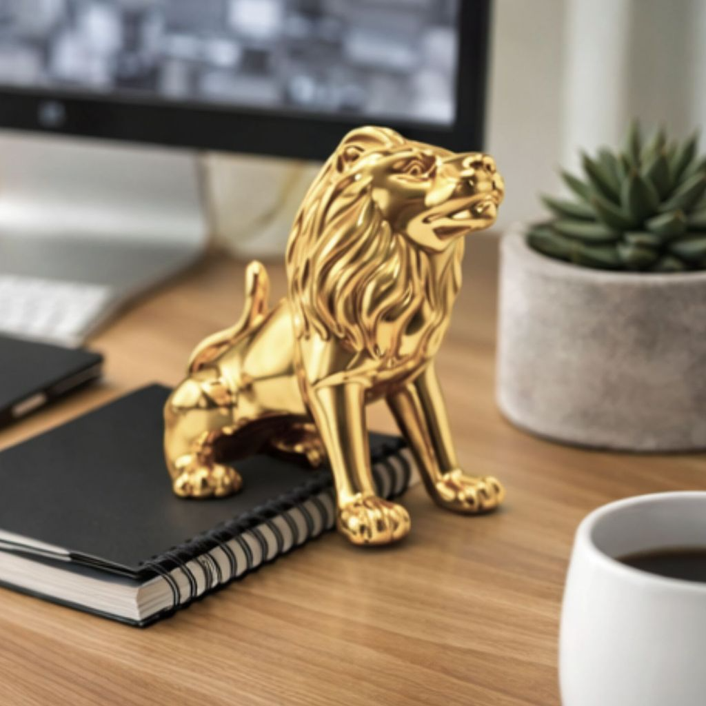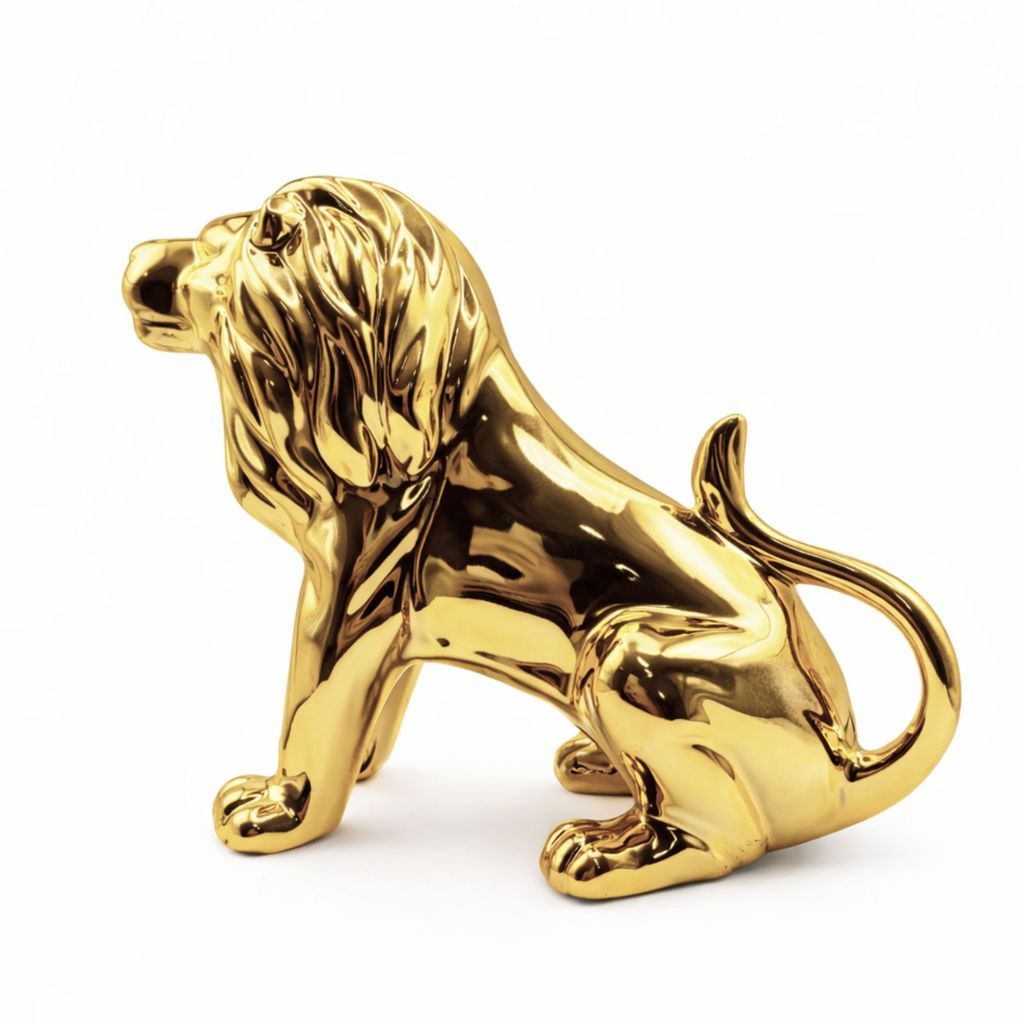 Leão decorativo em porcelana, uma peça sofisticada que transmite força, elegância e imponência. Possui design detalhado e acabamento metalizado de alto brilho, disponível nas cores prata ou dourado. Ideal para compor salas, escritórios, halls de entrada e ambientes corporativos, agregando luxo e personalidade à decoração. O leão simboliza poder, coragem, liderança e proteção.