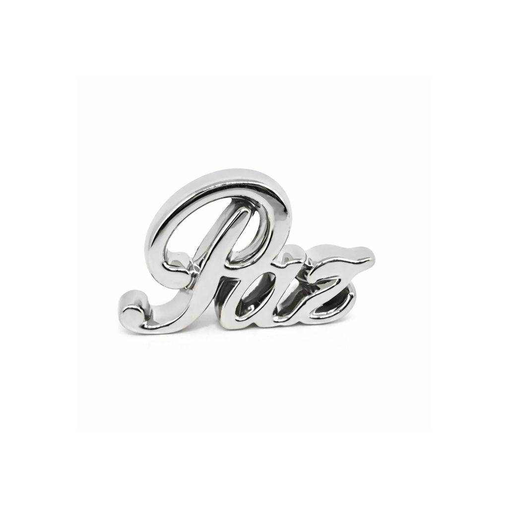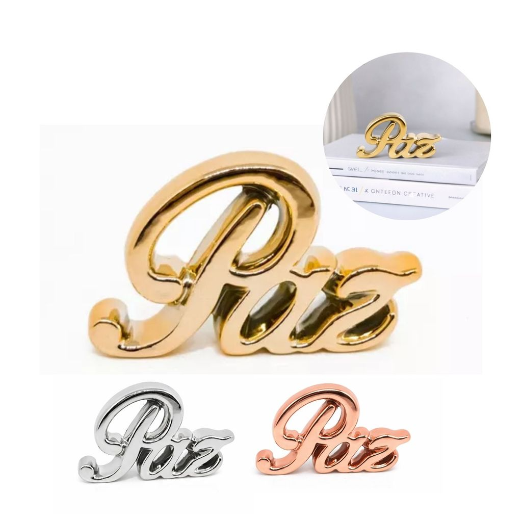 Ornamento decorativo em cerâmica com a palavra “Paz”, uma peça elegante e simbólica que transmite tranquilidade, harmonia e boas energias ao ambiente. Possui design moderno com escrita cursiva e acabamento metalizado de alto brilho, disponível nas cores dourado, prata e rosê. Ideal para decorar salas, quartos, escritórios, aparadores, estantes ou ambientes de meditação, trazendo sofisticação e significado à decoração.