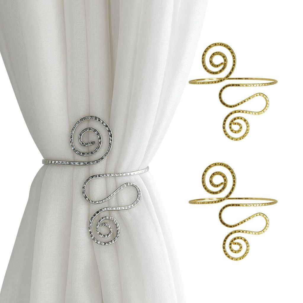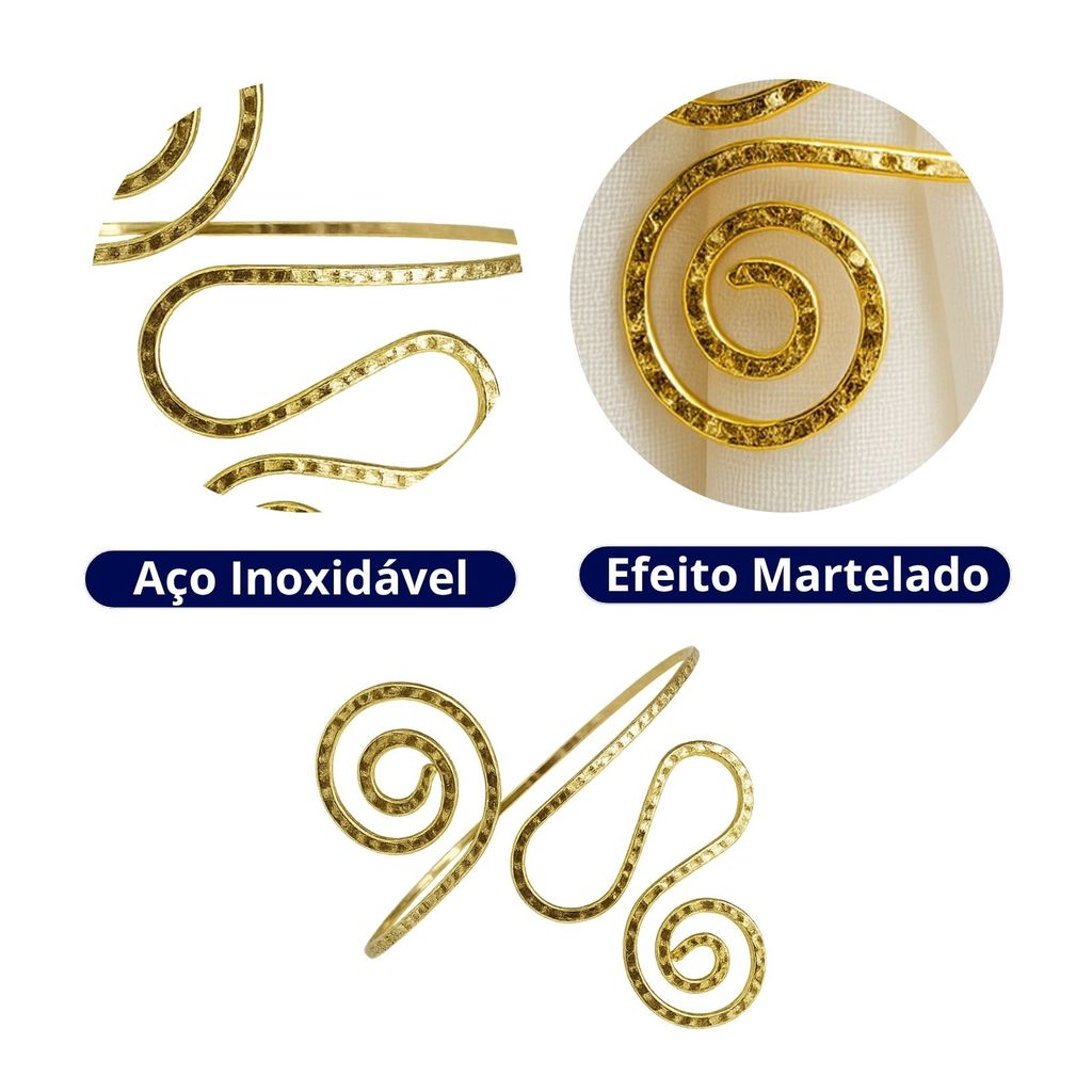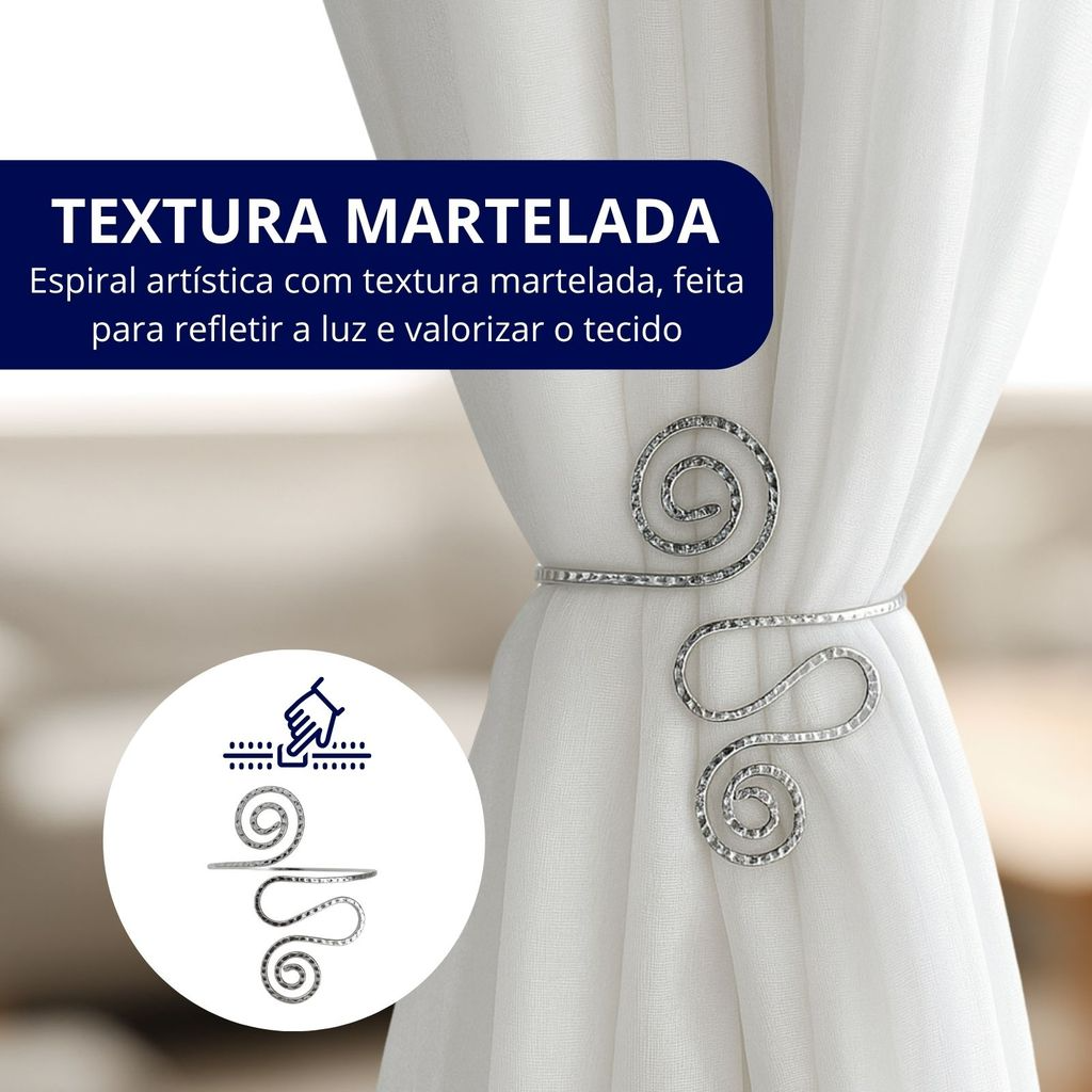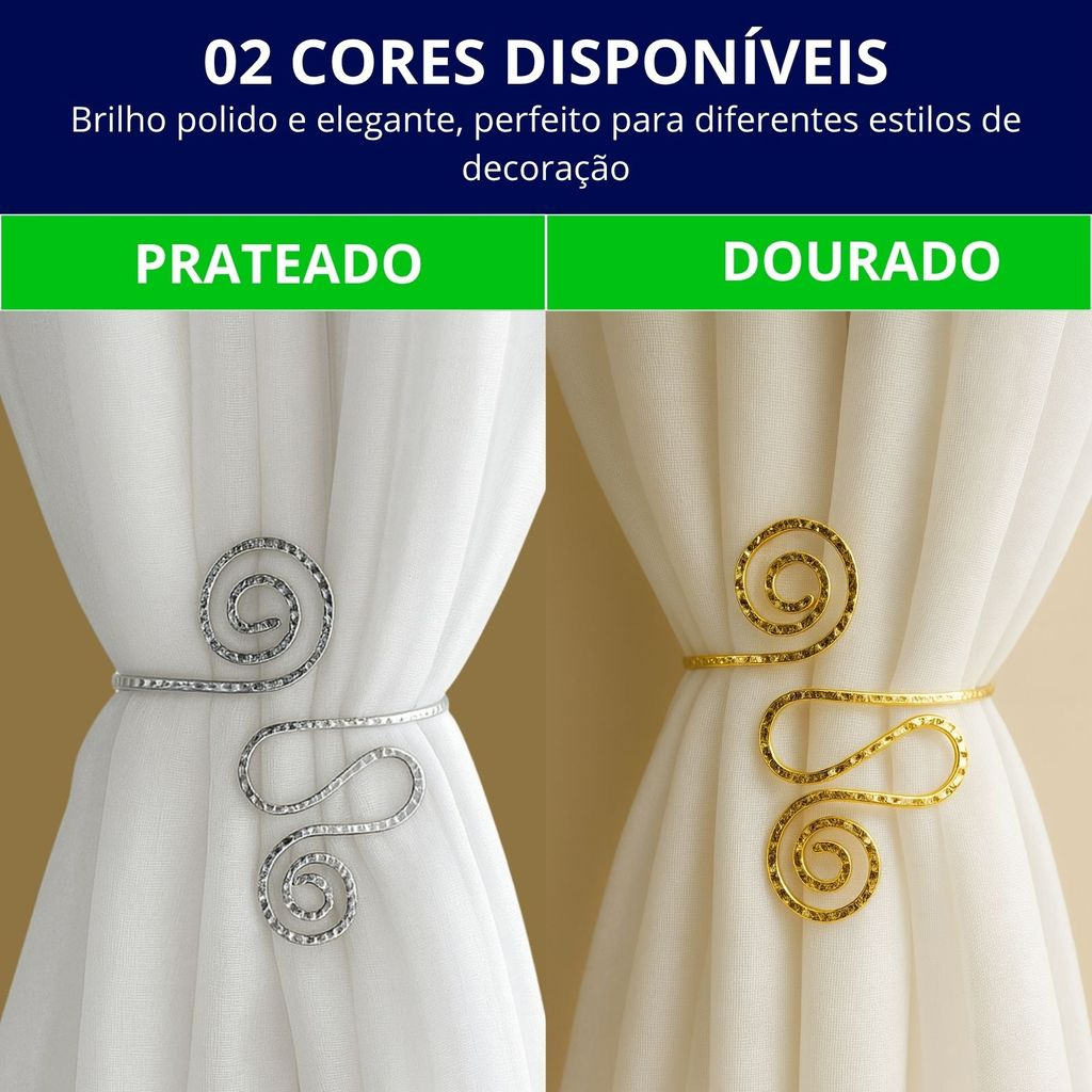 Disponível nas cores dourado e prata, o prendedor possui formato em espiral com textura delicada e acabamento brilhante, perfeito para complementar qualquer estilo de cortina — das mais leves às mais encorpadas.
