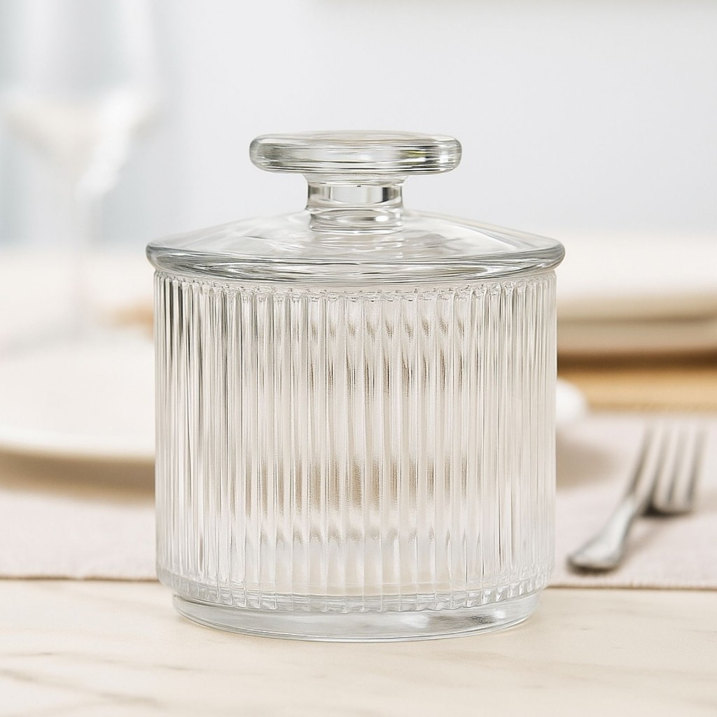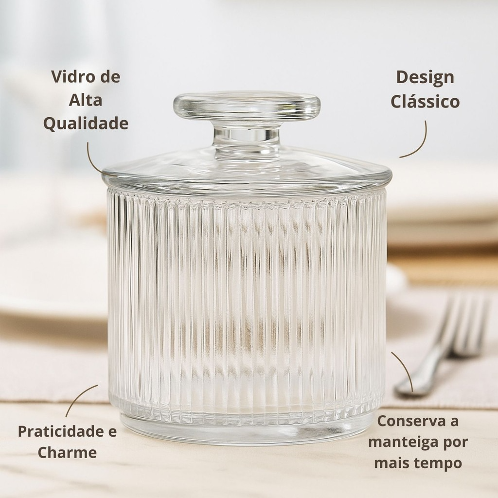 A Manteigueira Francesa de Vidro Canelado com Tampa Transparente é o equilíbrio perfeito entre elegância e praticidade.